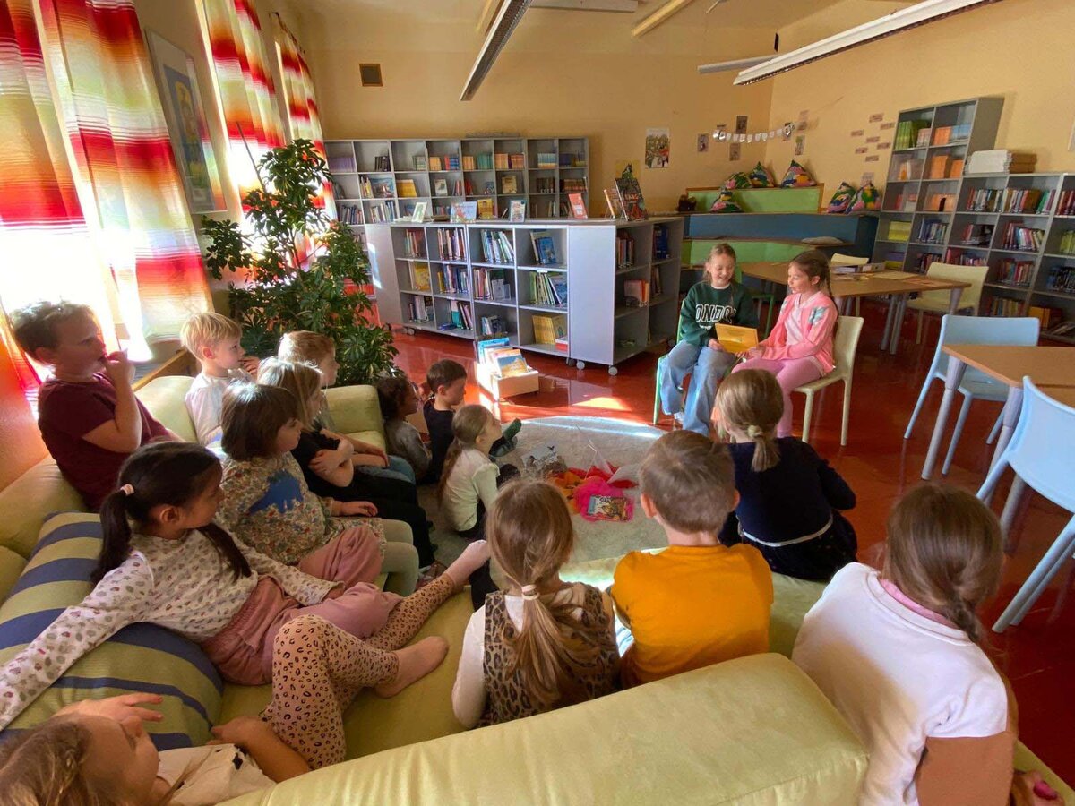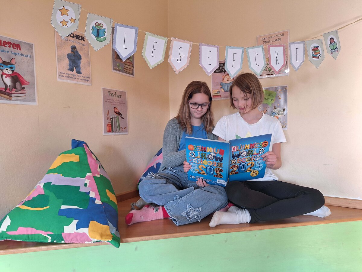 Die Bibliothek ist bei uns ein Ort der Begegnung. Wir nutzen sie für regelmäßige Vorlesestunden, gemütliche Schmökereinheiten und als Recherchezentrum für erste kleine Referate. Dabei legen wir großen Wert darauf, die Lesefreude zu fördern.