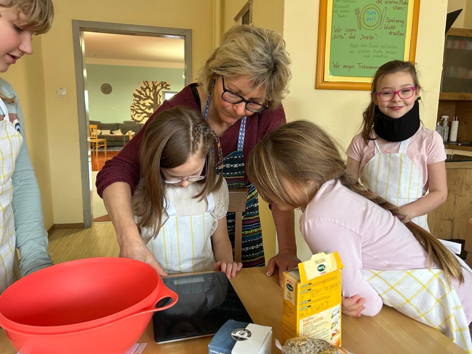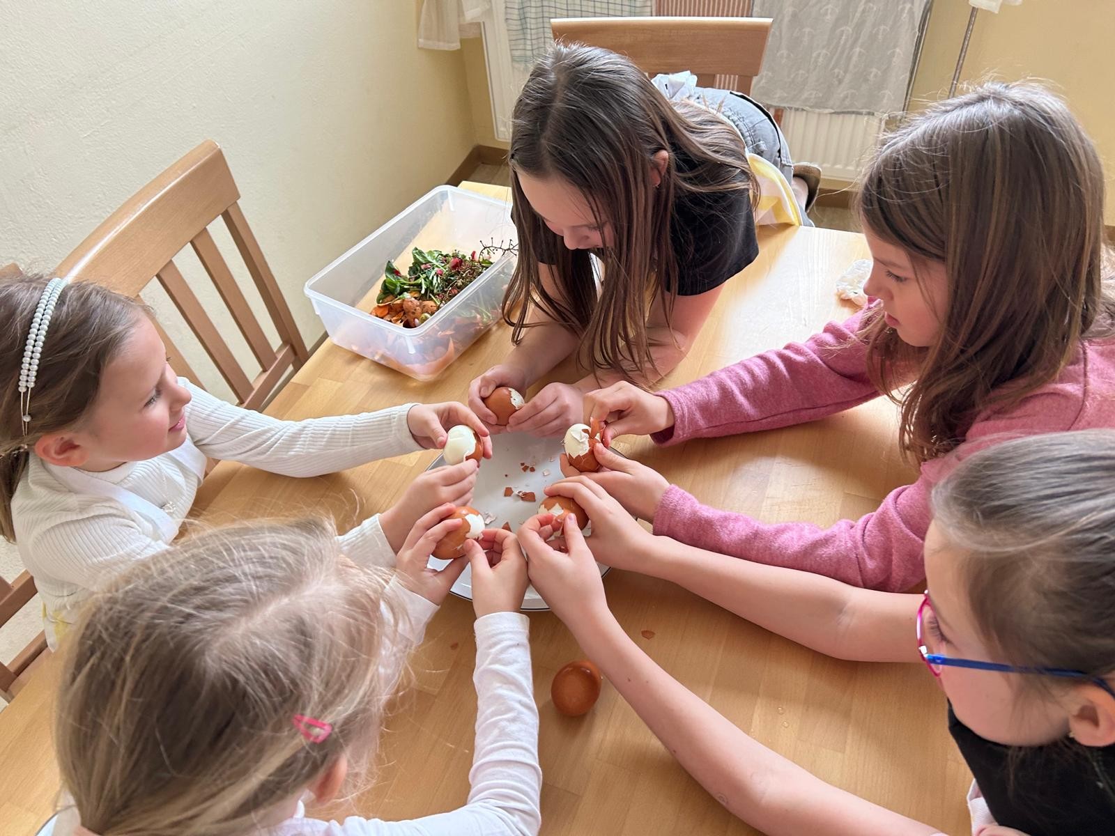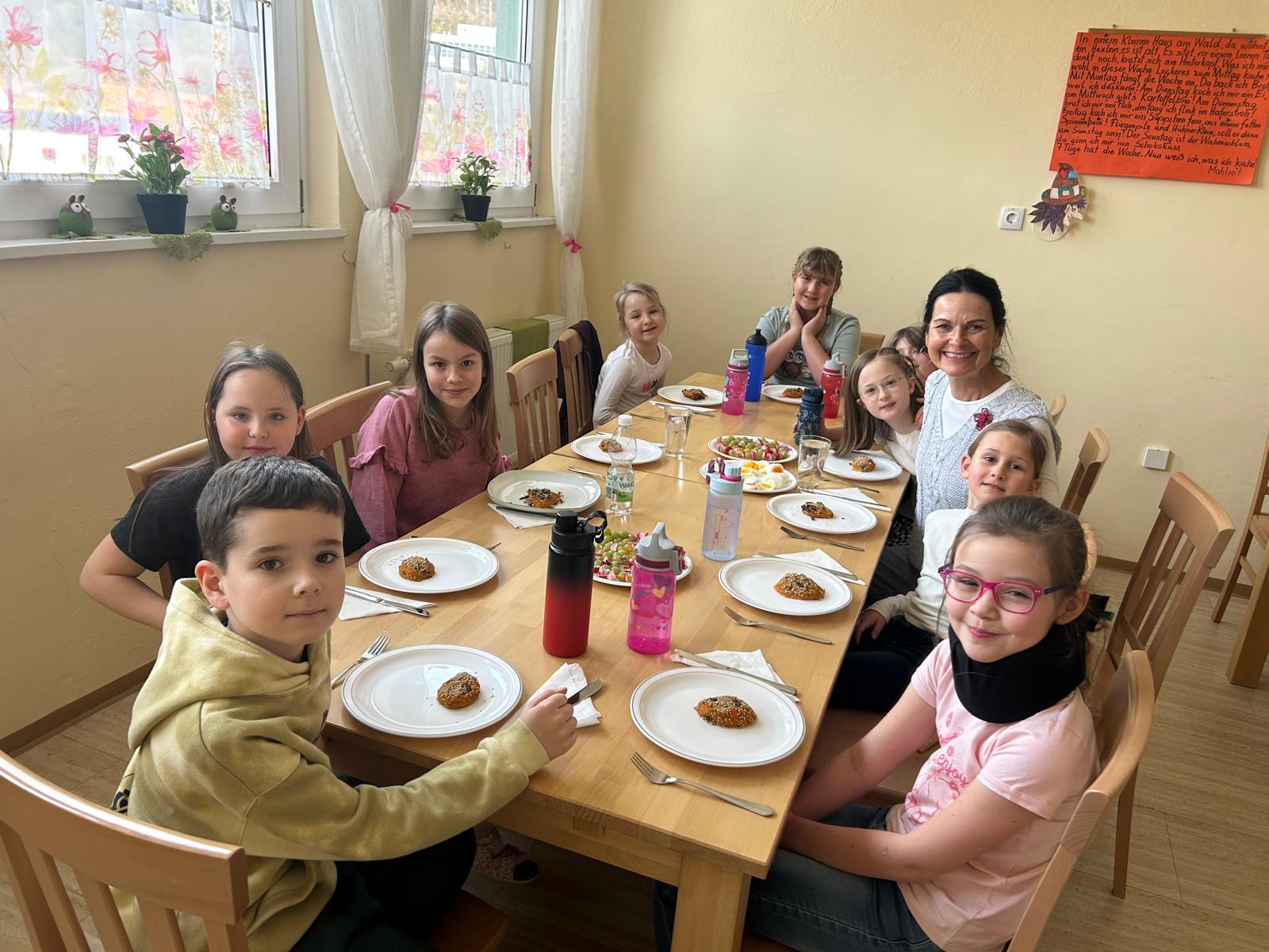 Praktisch setzten die Kinder das Thema beim Kochen um, luftige Süßkartoffelleibchen mit Radieschen, Weintrauben und Körnern. Zwischendurch wurde bewusst geatmet, geturnt und gespielt. Am Ende genossen alle gemeinsam das Essen.