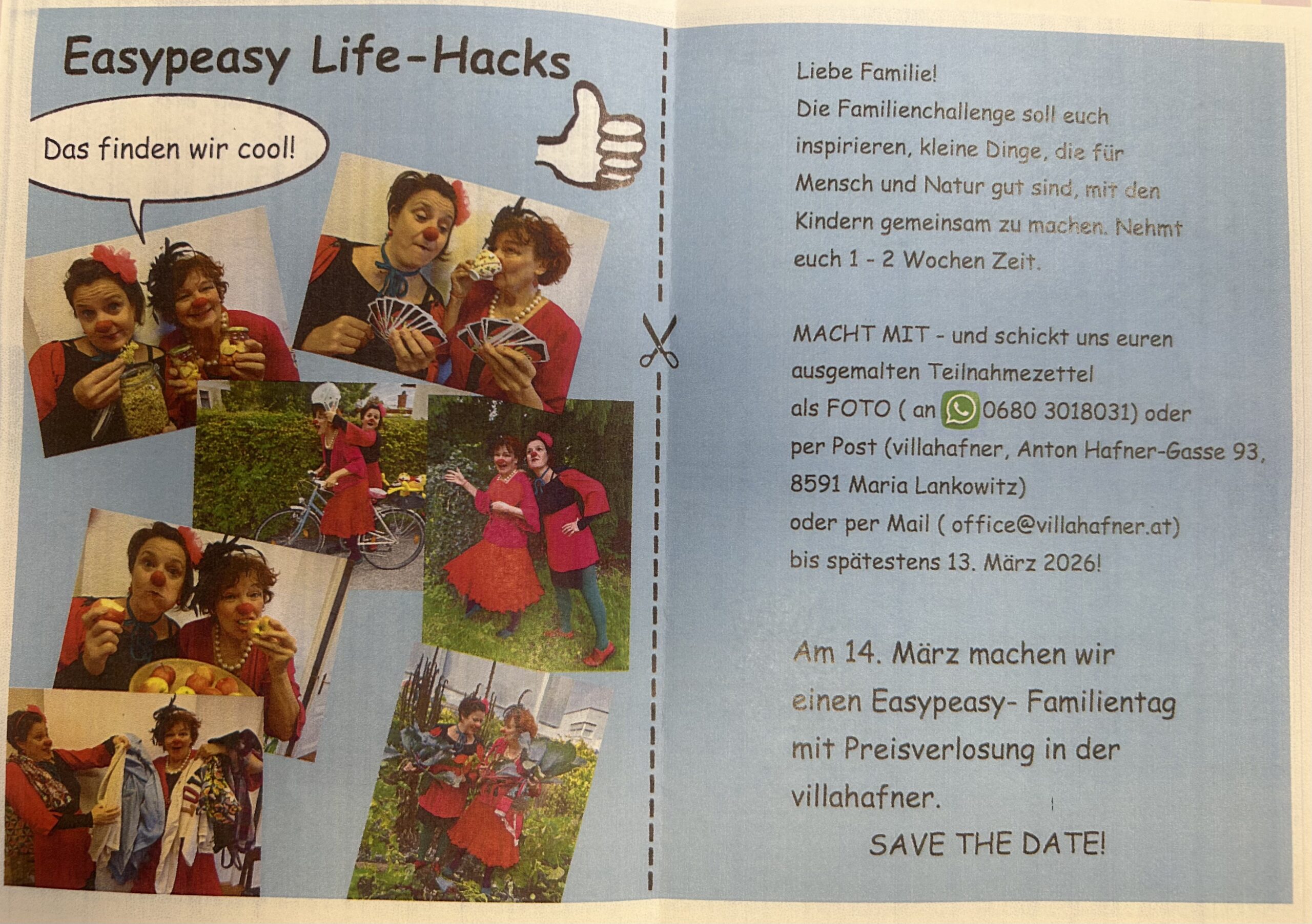 Zum Abschluss sprach Aurora eine herzliche Einladung an unsere Kinder und ihre Familien aus: Bei der „Family-Challenge“ am 14. März in der villahafner wartet eine große Verlosung, und es gibt die Möglichkeit, nicht mehr bespieltes Spielzeug weiterzugeben und zu tauschen – ganz im Sinne von Nachhaltigkeit und gelebter Gemeinschaft.
