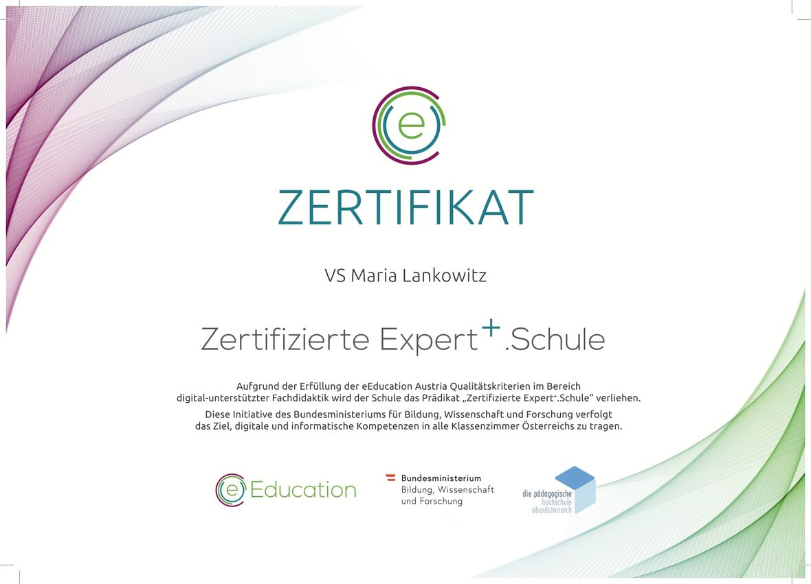 Aufgrund der Erfüllung der eEducation Austria Qualitätskriterien im Bereich digital-unterstützter Fachdidaktik wurde unserer Schule das Prädikat "Zertifizierte Expert + .Schule verliehen.